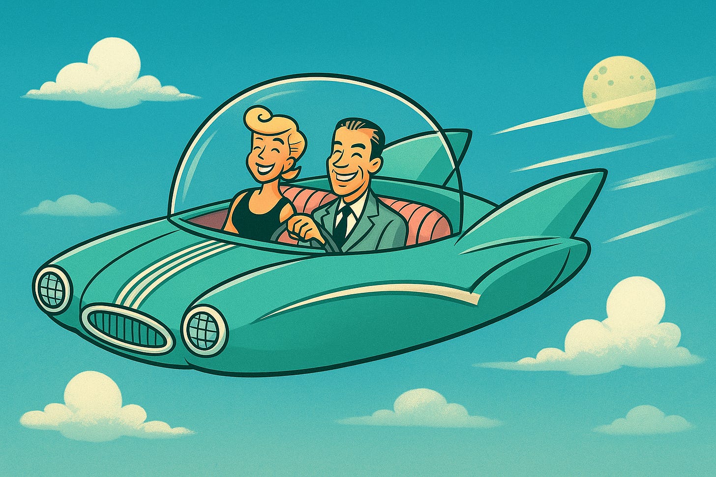 Because those of us who remember what the future was supposed to be—are grieving what was stolen. I used to joke with my spouse, “Where are my flying cars?” But the joke wore thin. We’re here now, a quarter of the way into the century, and it feels more like 1935 than 2035.